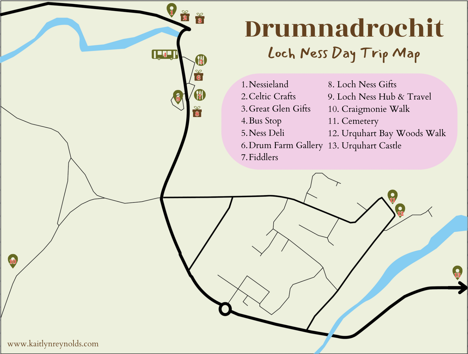 I have created a map of Drumnadrochit, highlighting where the best souvenir shops, hikes, sights and lunch options can be found!